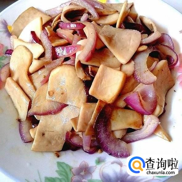 先把油倒入锅里,烧好油之后加入洋葱和蒜片,翻炒至有香味飘出,再倒入杏鲍菇。大火翻炒至杏鲍菇有点焦的时候,就把锅里的素材辅料等舀出来,备用。
