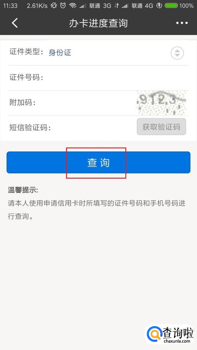 接下来,在打开的页面中,输入申请时所使用的身份证号码、手机号码和短信验证码即可查询到信用卡办理进度。
