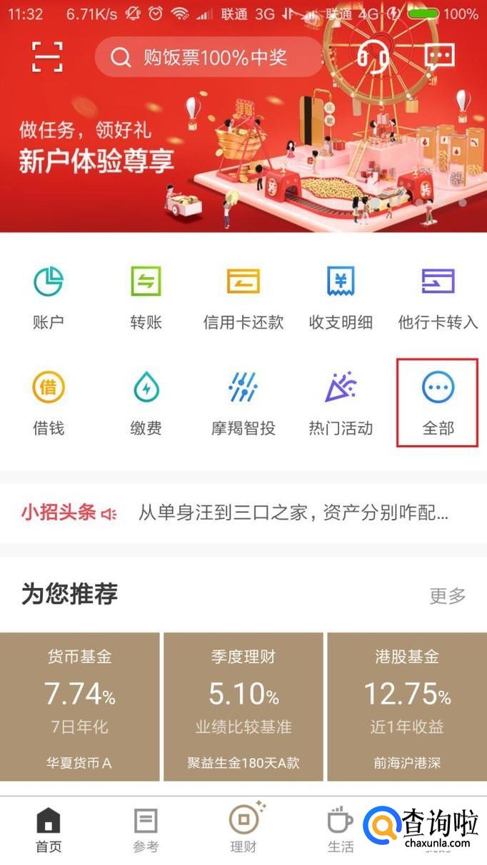 首先,打开招商银行App应用主页面,点击页面中的“全部”菜单按钮。