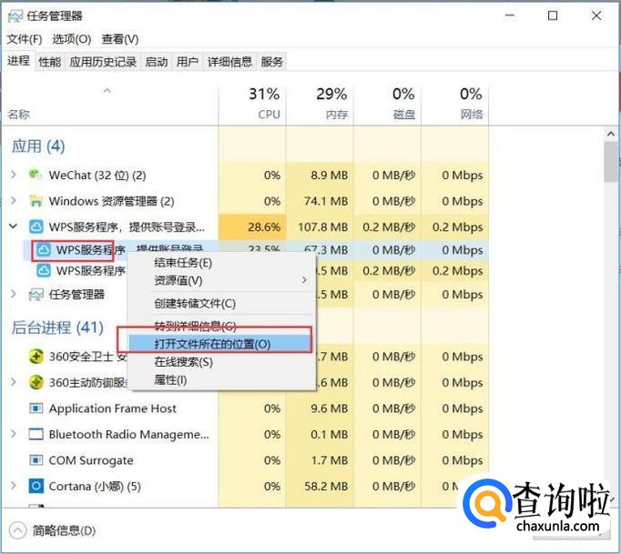 接下来,在打开的任务管理器中,找到运行的WPS云文档程序图标,击右键,选择“打开文件所在的位置”选项。