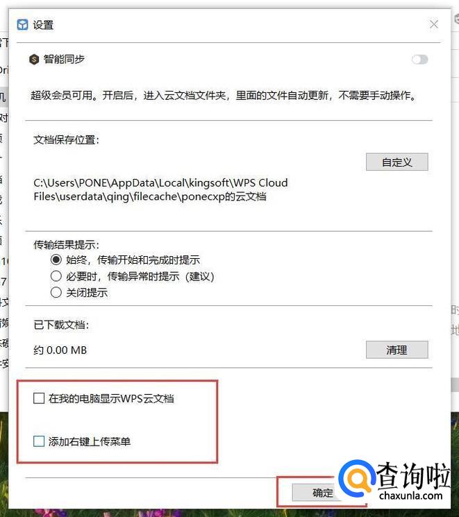 在接下来打开的WPS云文档软件设置窗口中,点击取消勾选“在我的电脑显示WPS云文档”选项,并点击“确定”按钮保存。