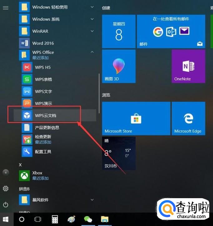 首先,我们打开Win10系统开始菜单,找到“WPS Office-WPS云文档”软件快捷方式项目。