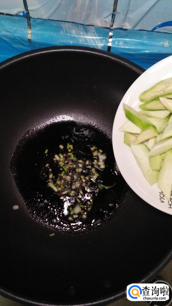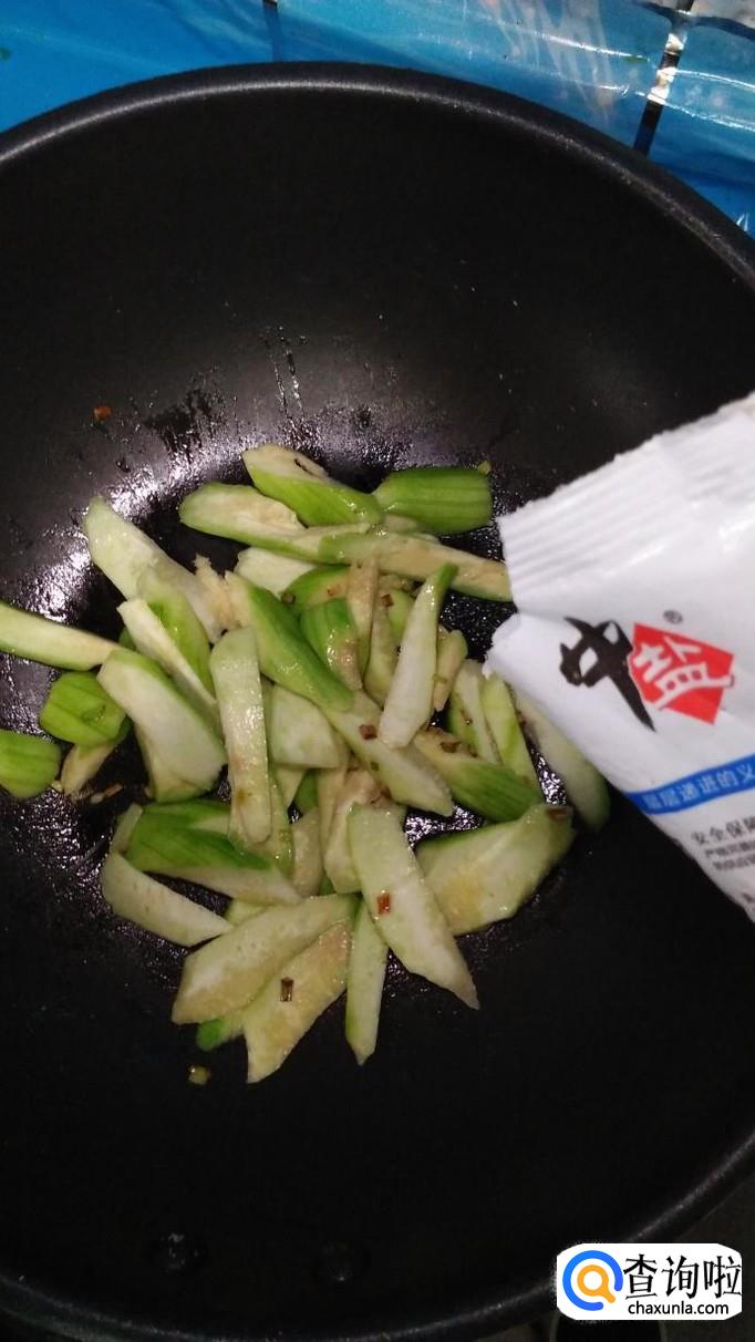 将准备好的丝瓜块放入锅中翻炒,炒至丝瓜微微变软,加入少许食盐。食盐的量可以根据自己的口味进行添加。