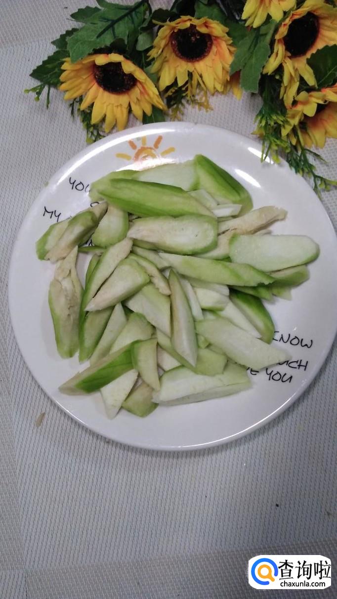准备一根丝瓜,洗净去皮后,切成滚刀块儿,放入盘中备用,大家一定要选用新鲜的丝瓜,不然老的丝瓜瓤会很难吃的。