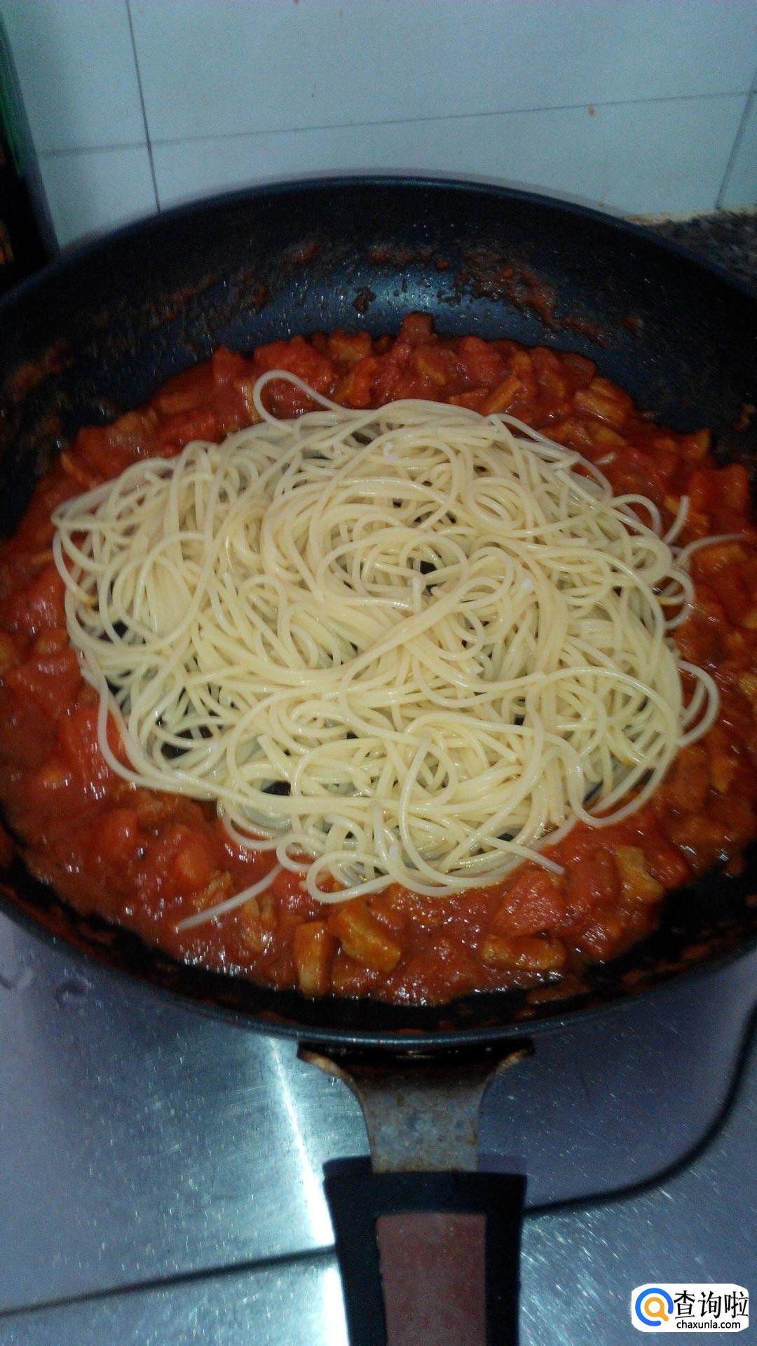 炒好酱料后关火,倒入意大利面和酱料搅拌均匀,然后出锅装盘即可食用。