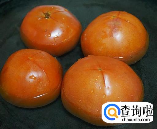 番茄在顶部用刀划一个十字,放入沸水中浸泡5分钟(目的是为了能更好的撕下番茄皮,方便烹饪,吃的时候也不用挑挑拣拣)。