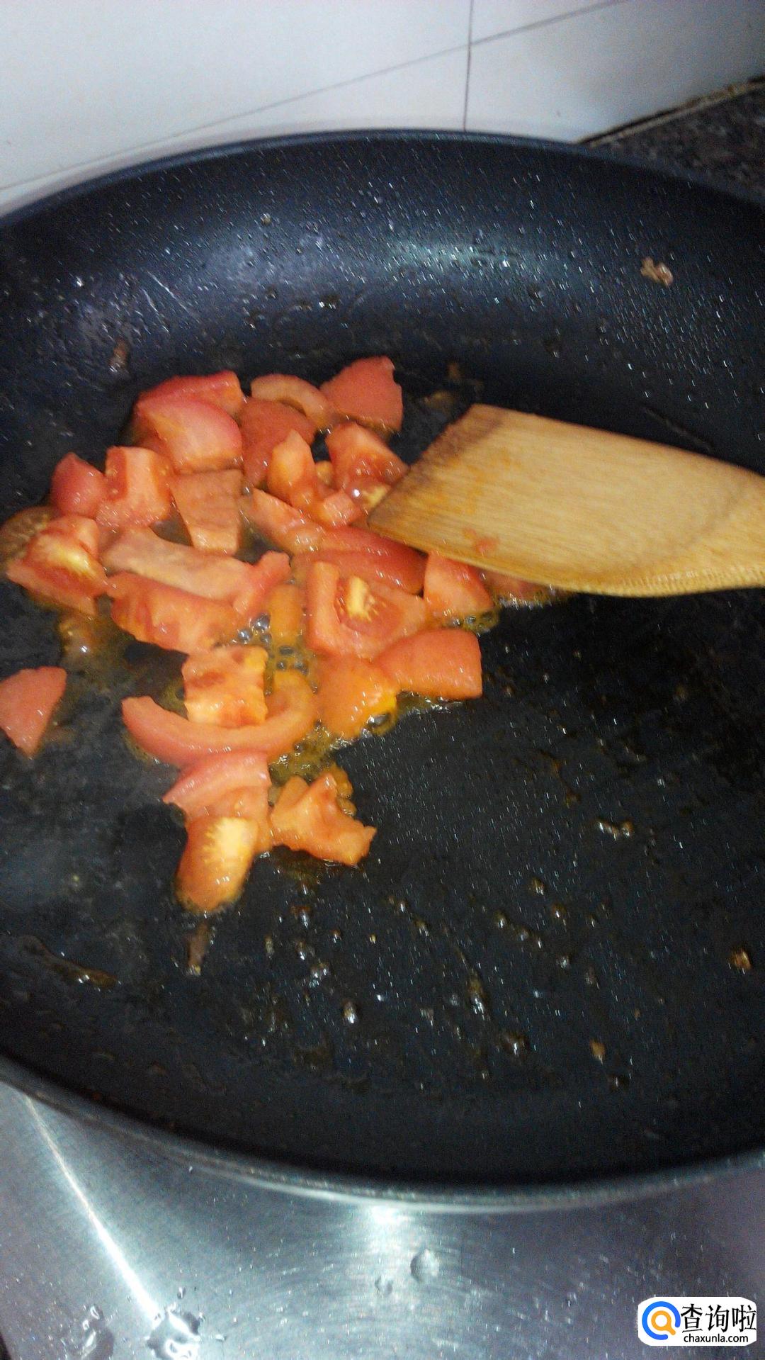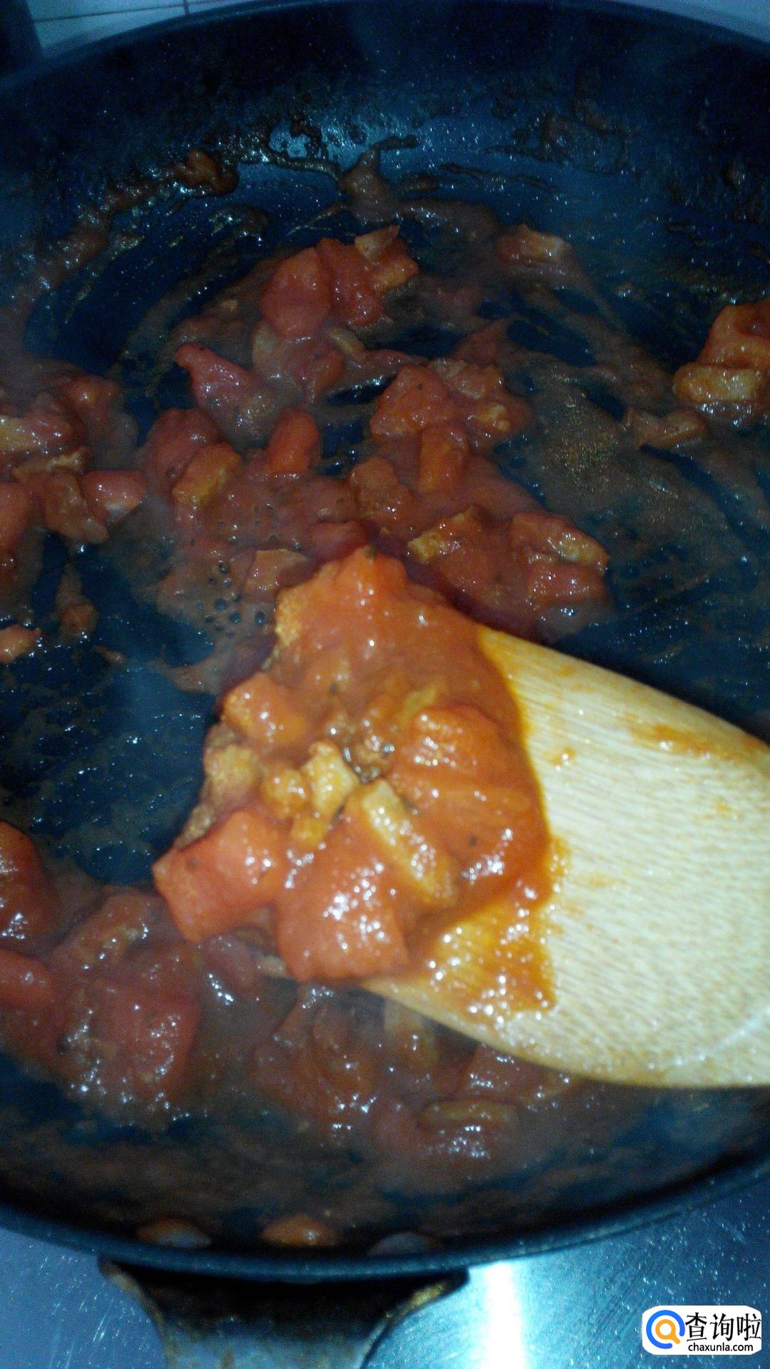 锅内加入少许橄榄油(不能加菜籽油花生油!太香腻了容易影响成品口感),将番茄丁放入炒锅内炒软,并烧出些许的汁儿。