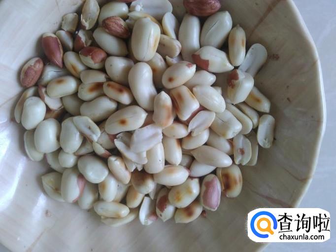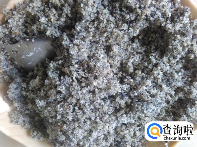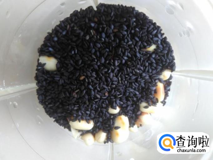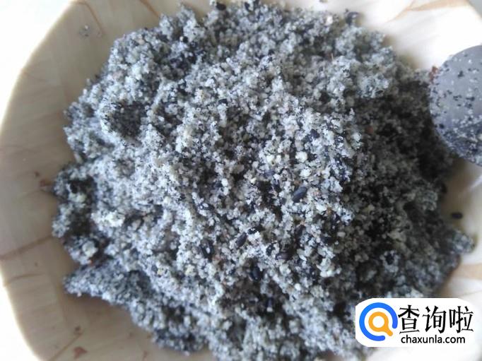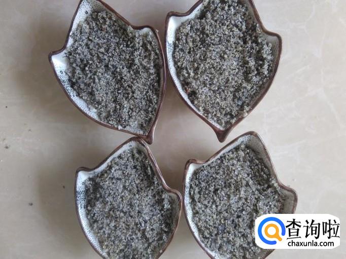 然后把脱了皮的花生米和芝麻放到打粉机打成粉末,再倒到碟子里。