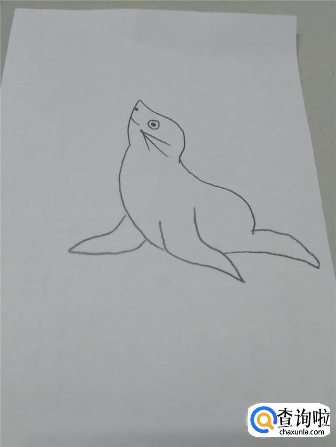 最后,在它头部上方画一个圆形,表示球,在球里再画两条弧线,表示上面的花纹,海豹就画完了。
