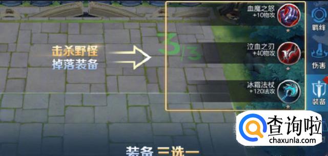 在击杀野怪后还会掉落不同的装备,这里3种装备是可以任选一个的,英雄有了装备之后也会更强大,同时2个相同的装备还能合成高一星级的装备,3星的装备更是有强大的被动效果。