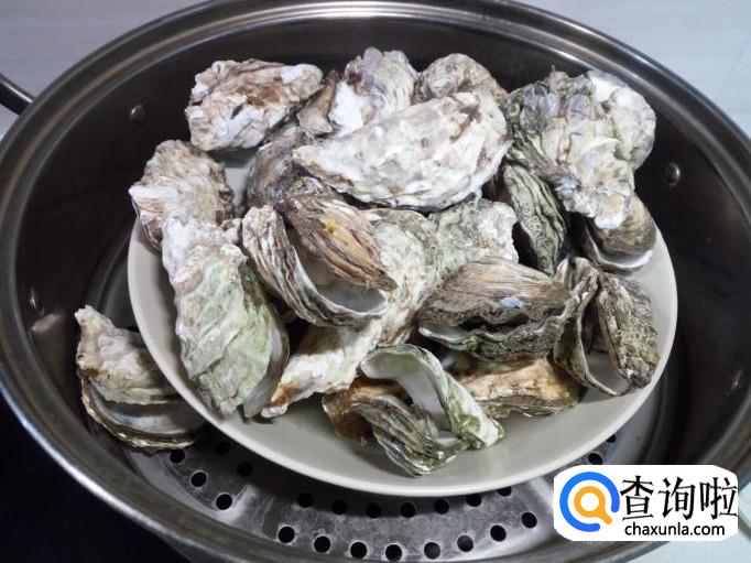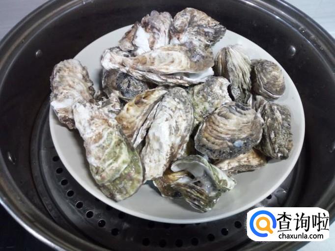 把生蚝上锅蒸。开锅后,大约蒸五,六分钟的时间,蒸至生蚝开口后,关火。