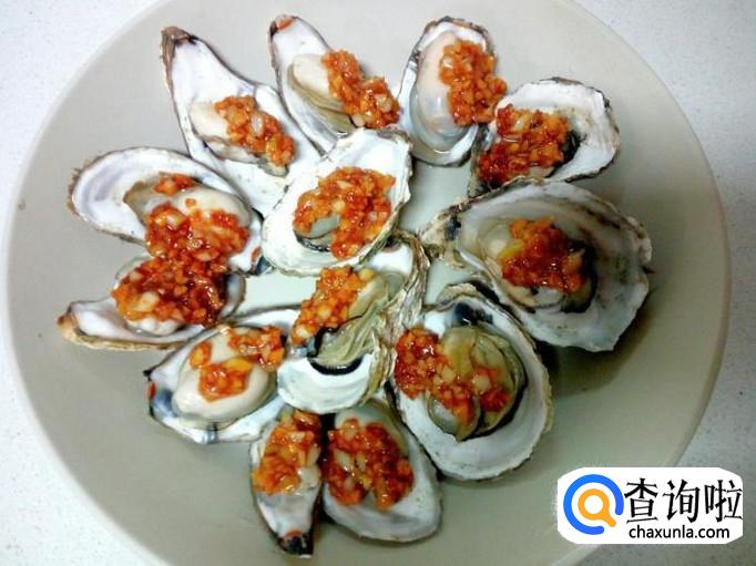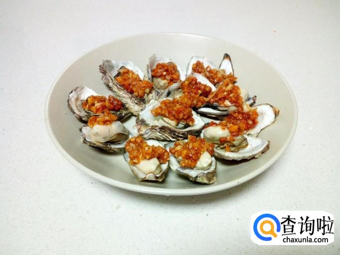 把蒸好的生蚝,去掉外壳,然后摆放在盘中。用匙儿把炒好的蒜蓉,放在蒸熟的生蚝肉上就可以了。