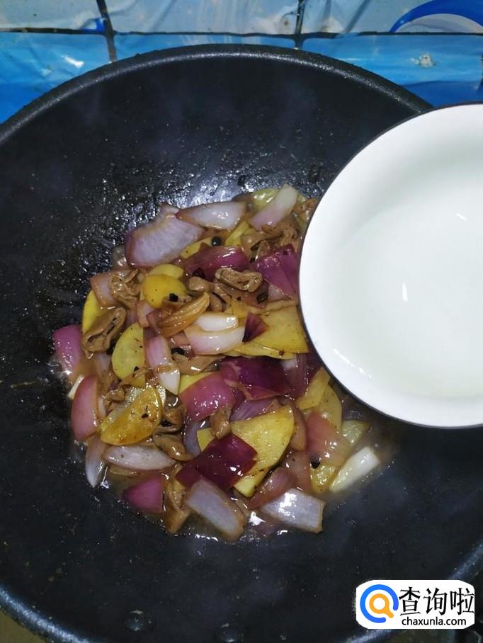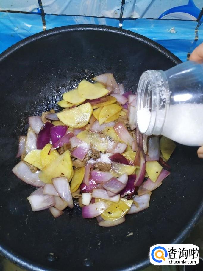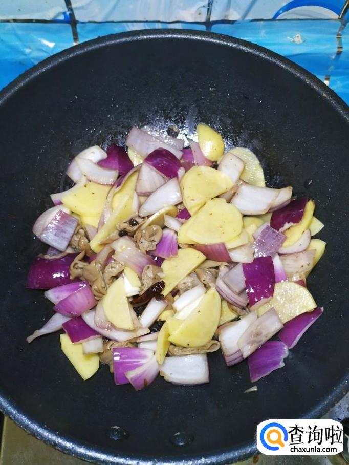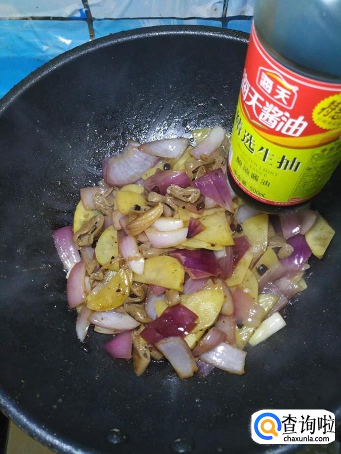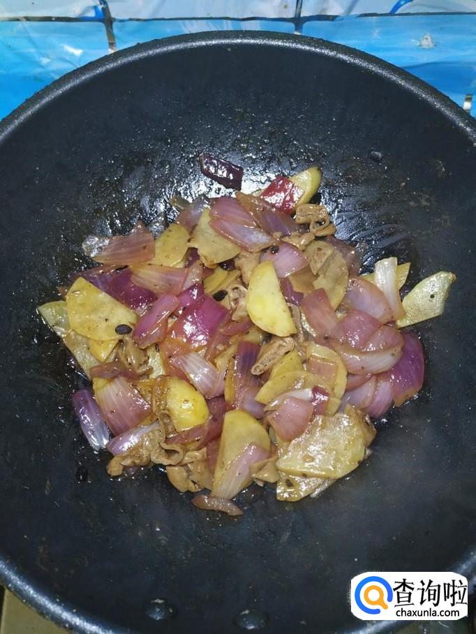 将洋葱和土豆片儿,倒入锅中,翻炒均匀。