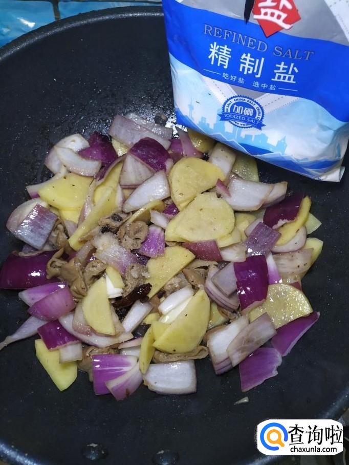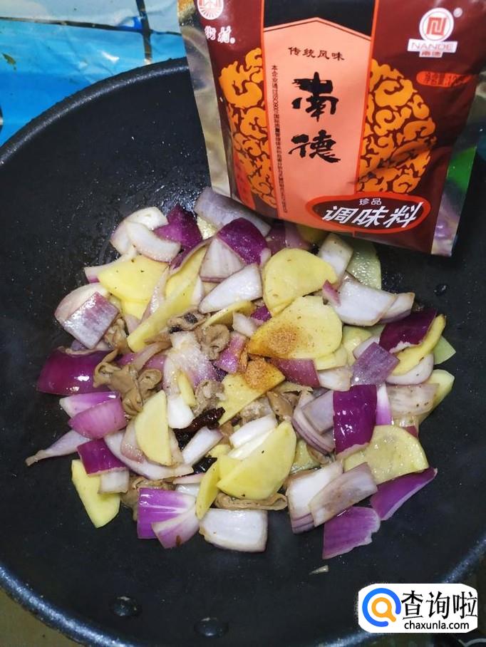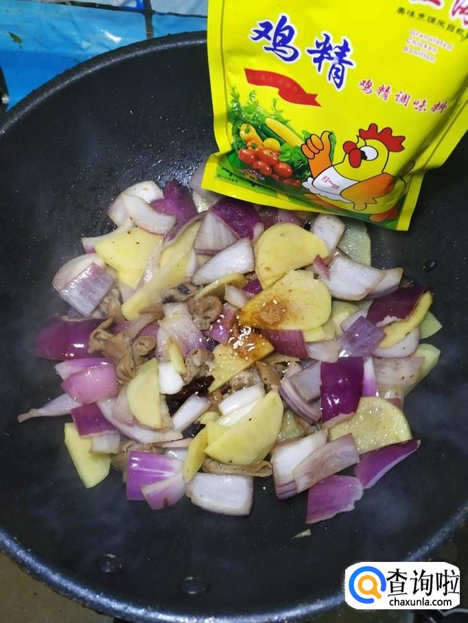 炒至食材微微变软之后,根据自己的口味,加入适量的盐,五香粉,鸡精,搅拌均匀。