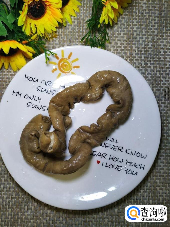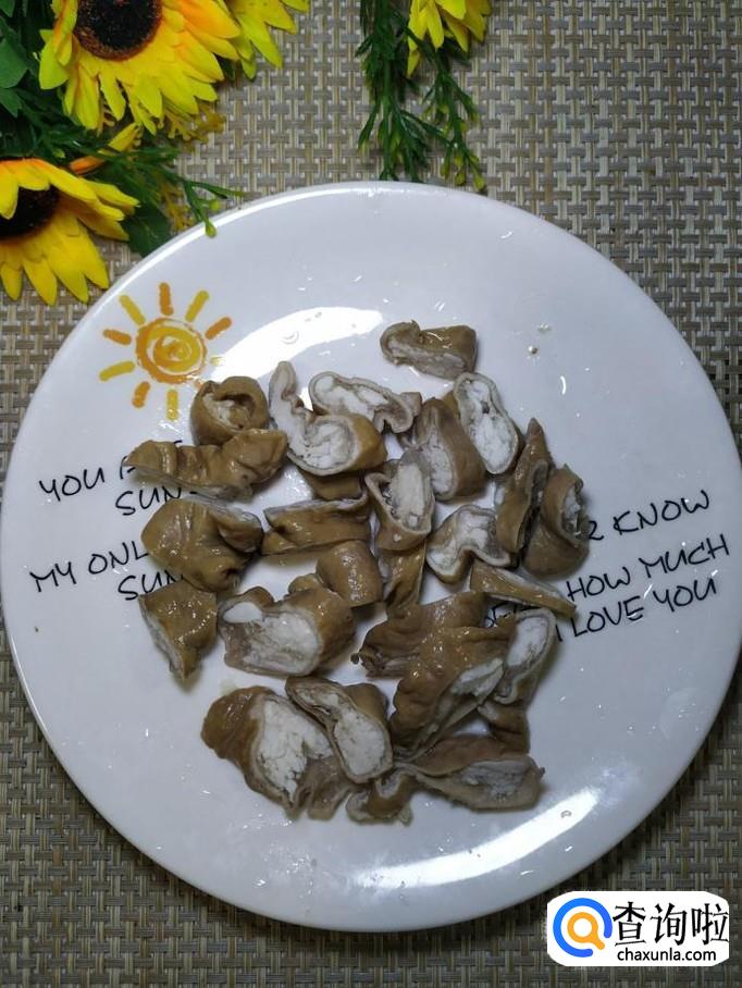 准备一根卤过的猪大肠,然后用刀切成块,放入盘中备用。注意,这里使用的猪大肠已经用高压锅卤过了,已经有九分熟了。