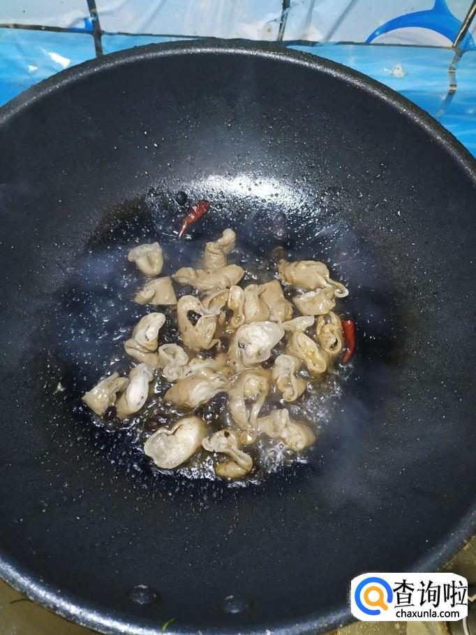 将准备好的猪大肠倒入锅中,翻炒均匀。