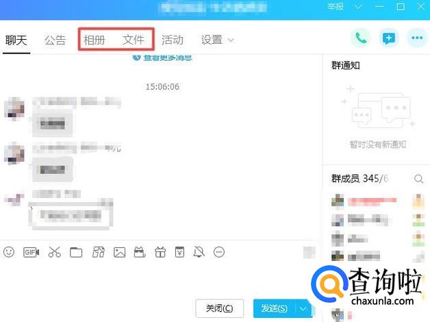 弹出的聊天窗口,我们可以看到上方的相册和文件,现在的群共享其实已经被改善了,并不需要去专门找了,上方的相册和文件都是群共享的内容,我们点击其中一个,我们点击文件;
