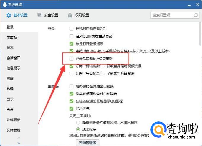 在基本设置面板下,找到“登录后自动运行QQ宠物”,将其前面的对勾去掉即可将QQ宠物关闭,如图所示。