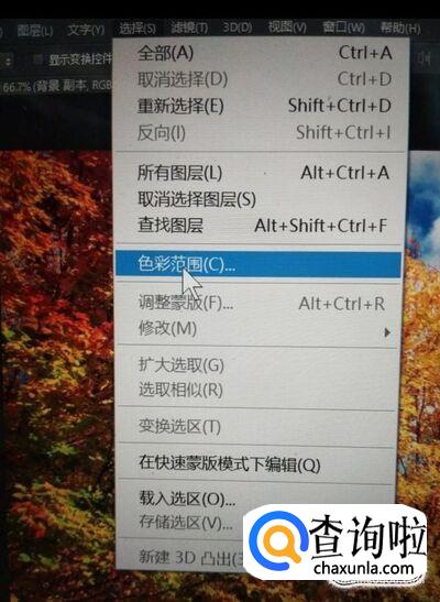 如果快捷键无反应,我们可以点击上边栏的“选择”,再点击“色彩范围”。
