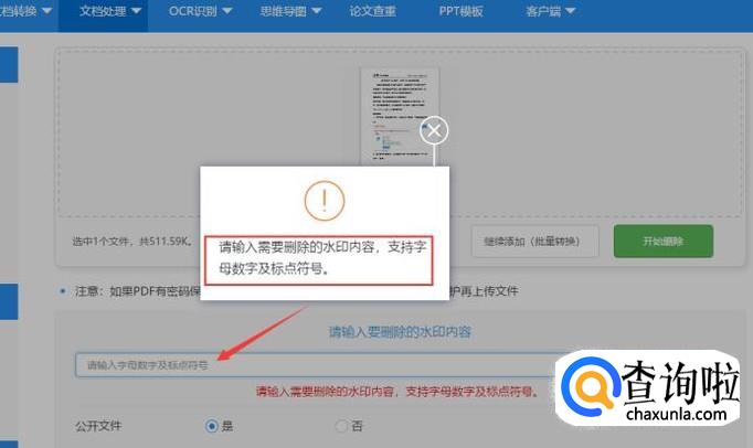 上传好了之后,立刻会出现一个开始删除,但是注意的是要提前编辑要删除的水印内容,否则会弹出一个对话框要求:请输入需要删除的水印内容,支持字母数字及标点符号。