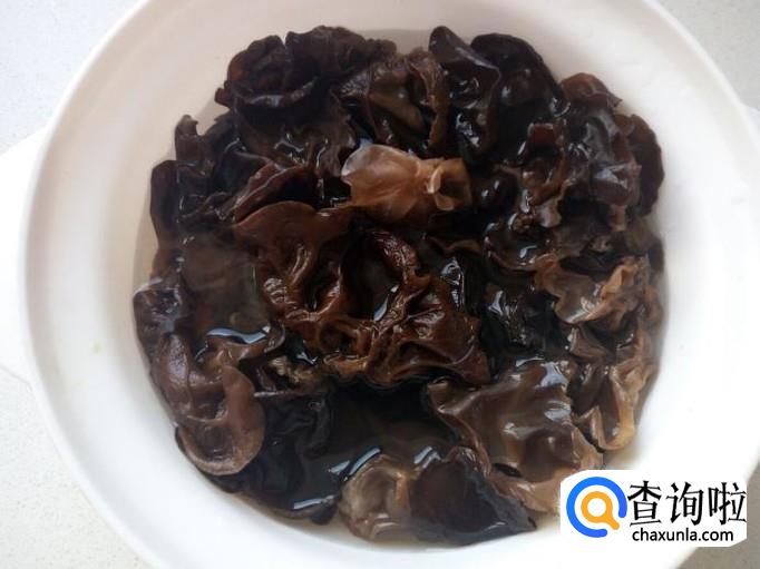 用温水快速泡发木耳,把泡发好的木耳收拾清洗干净,攥干水分,避免翻炒时炸锅。