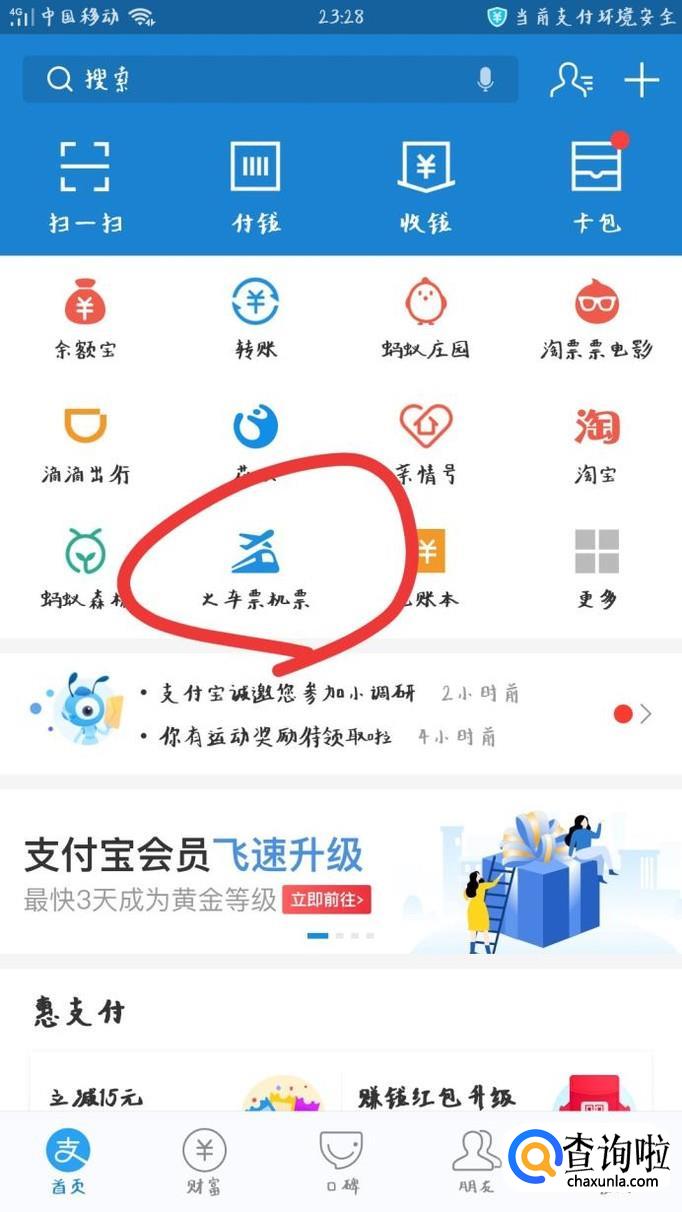 手机改签火车票可以使用“支付宝”软件来改签,首先下载支付宝软件后,点击打开支付宝,进入首页,点击下方“火车票/机票”选项。