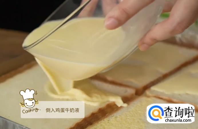 将搅拌好的鸡蛋牛奶液均匀地倒在吐司面包片上,尽量让每一片吐司都充分地沾上鸡蛋牛奶液。