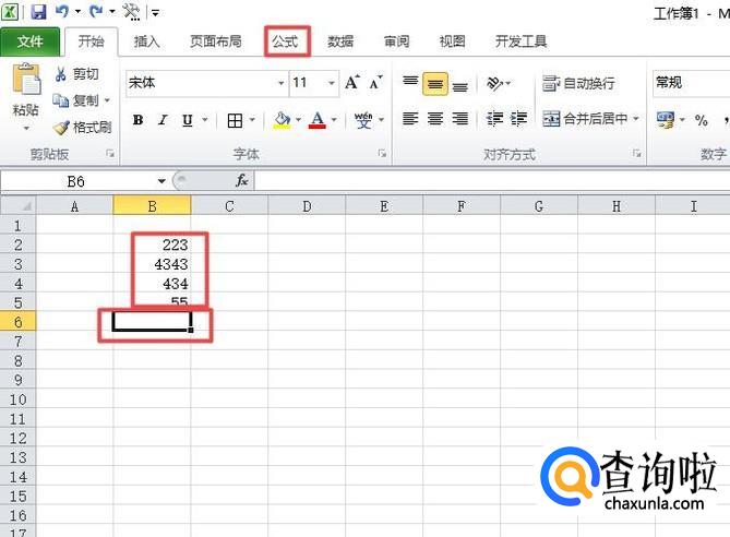 首先,我们打开excel,然后我们输入一些数字,之后我们选中图示中的单元格,然后点击公式;