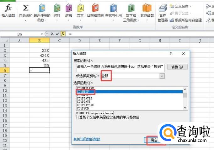 然后我们将选择类型设置成全部,之后我们找到COUNTIF,然后点击选中它,之后点击确定;