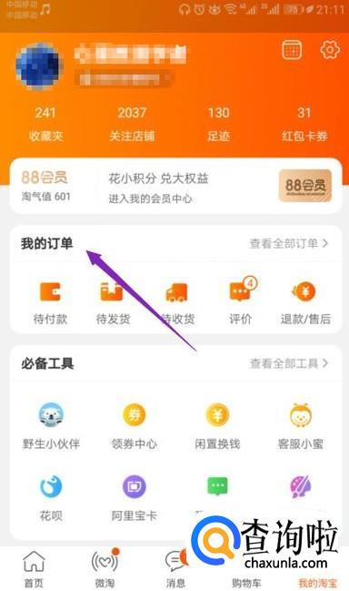 先进入手机淘宝,然后点击手机淘宝中的我的淘宝;