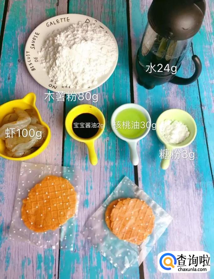 首先准备好所有的食材,如下图所示。小贴士:木薯粉80克,虾100克,酱油2克,核桃油30克,糖粉3克,水24克。