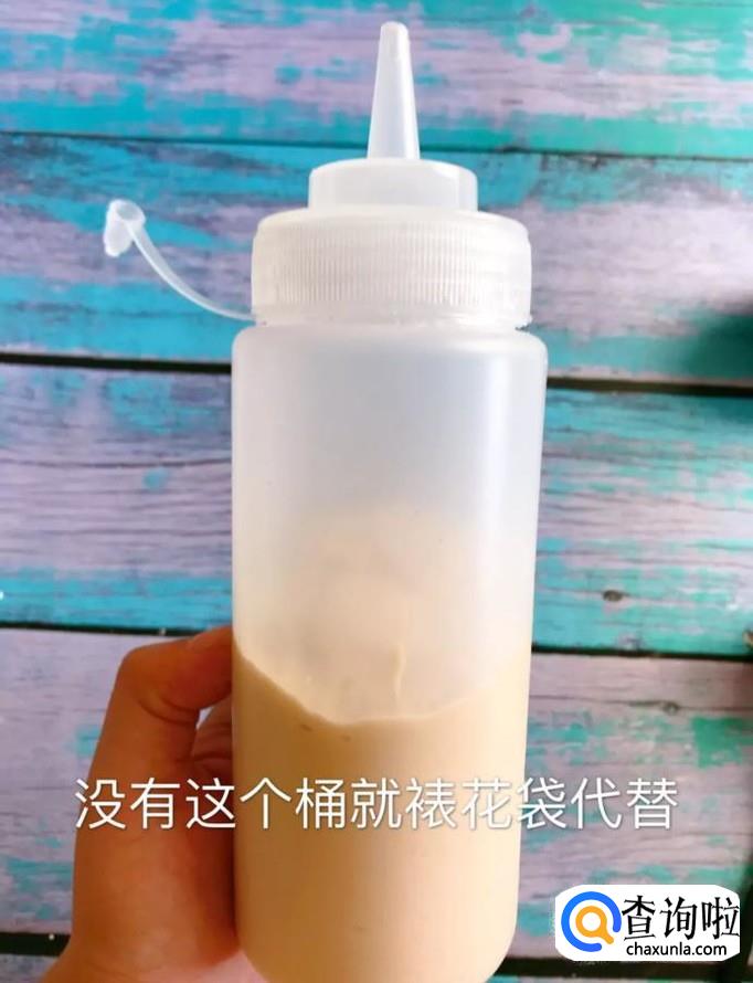 然后将面糊装进料理桶,如果没有料理桶,可以用裱花袋代替。
