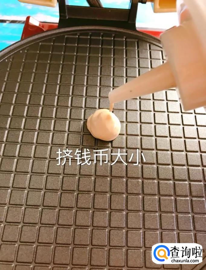 接着在蛋卷机中挤上一个钱币大小的圆,然后盖上盖子,烤15五秒左右就可以了。