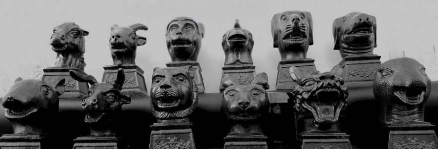 圆明园十二生肖兽首铜像原为圆明园海晏堂外的喷泉的一部分,是清乾隆年间的红铜铸像。南岸分别为子鼠、寅虎、辰龙、午马、申猴、戌狗;北岸则分别为丑牛、卯兔、巳蛇、未羊、酉鸡、亥猪。1860年英法联军侵略中国,火烧圆明园,兽首铜像开始流失海外。圆明园十二生肖铜兽首找回8个。