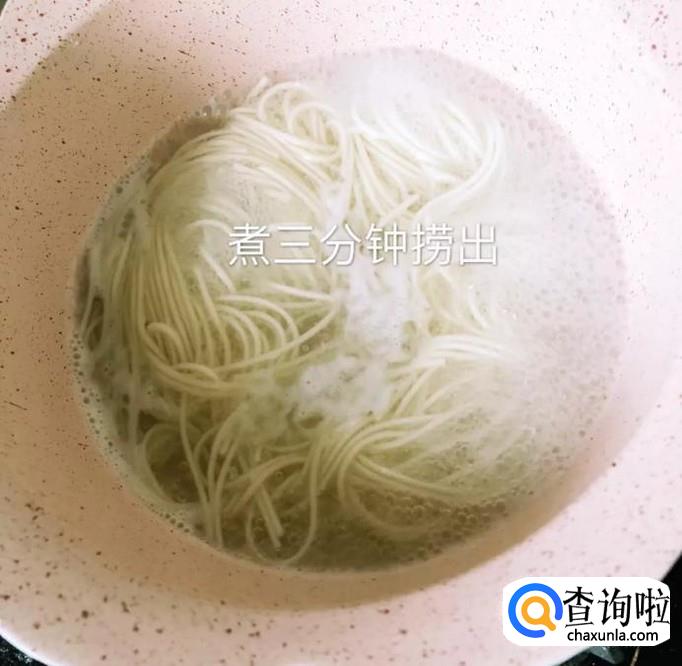 接着将面条煮三分钟,捞出用冷水冲洗干净,如下图所示。