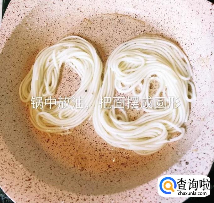 然后锅中放入适量的食用油,待油冒烟,把面摆成圆形,如下图所示。