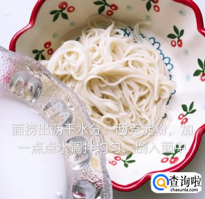 然后将面捞出沥干水分,加入两克淀粉水,搅拌均匀,如下图所示。