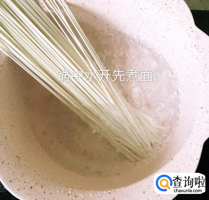 然后往锅中放入适量的清水,待水烧开,加入面条,如下图所示。