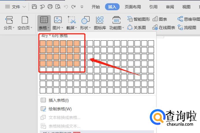 鼠标左键点击在弹出的格子区域选择需要的表格大小,松开鼠标后格子就出现在文档中了。