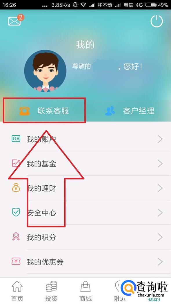 点击了我的按钮后,我们就会看见我们的信息主页,然后这里我们点击“联系客服”,然后我们就可以在电话里办理更换银行预留手机号码业务啦。