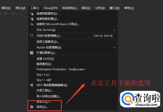 首先打开Visual Studio软件,点击顶部的工具菜单,然后选择最下面的选项,如下图所示