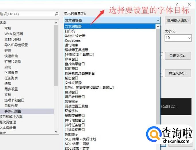 在右侧出现的界面中点击显示设置下拉框,选择要设置字体的目标对象,如下图所示