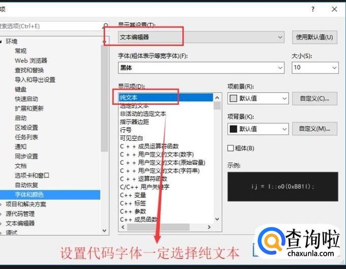 如果要设置代码文本字体则需要选择文本编辑器,然后显示项选择纯文本,这样就可以设置代码的字体样式了,如下图所示