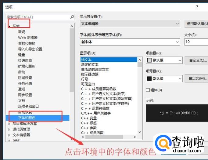 接下来在弹出的选项界面中单击环境下面的字体和颜色选项,如下图所示