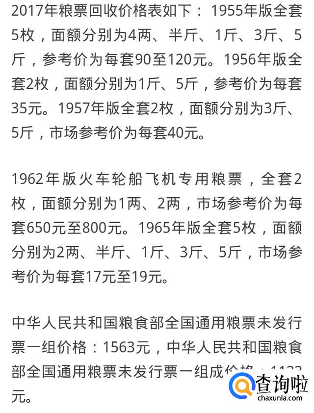 据统计。全国粮票自1955年至1982年,先后共发行9种年版(9套)计33枚。目前,它们的价格分别为:1955年版全套5枚1500元左右,1956年版全套2枚150元左右,1957年版全套2枚60元左右。