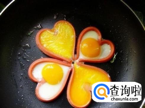 然后把心形的火腿肠放入锅里面煎,这个时候我们就可以把鸡蛋放入火腿肠里面了。
