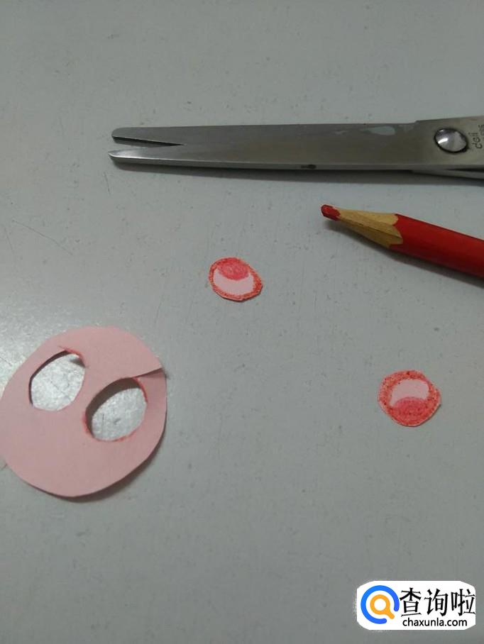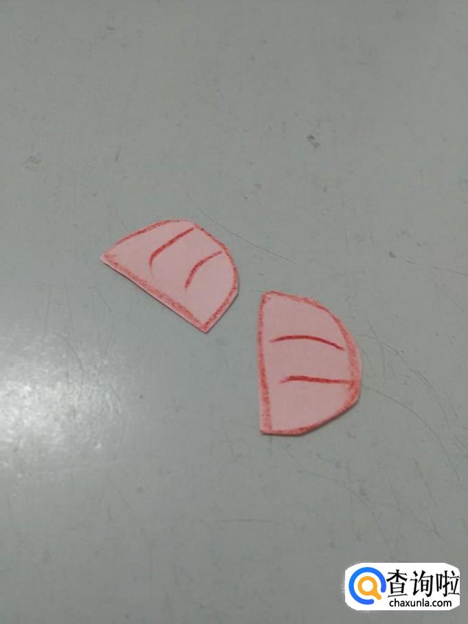 再用彩笔画两个圆形,表示眼睛,在眼睛里各画一个圆点,表示眼珠,把眼睛剪下来,粘在耳朵下面。