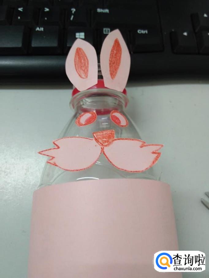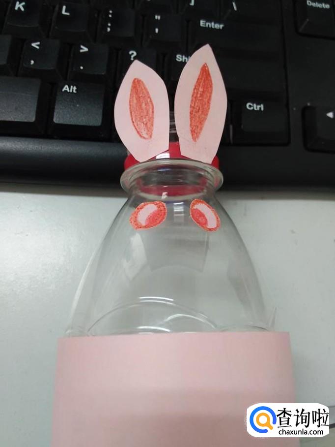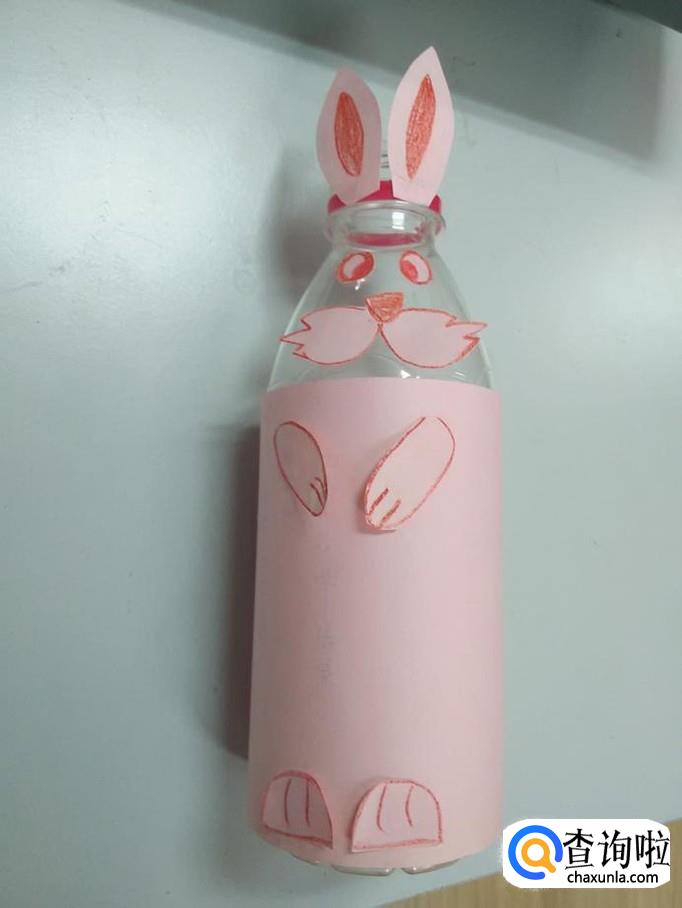 再画两个半圆形,表示脚,在半圆形中间各画两条竖线,表示脚趾,把两只脚剪下来,粘在瓶子下方,一个可爱的小兔子手工就做好了。