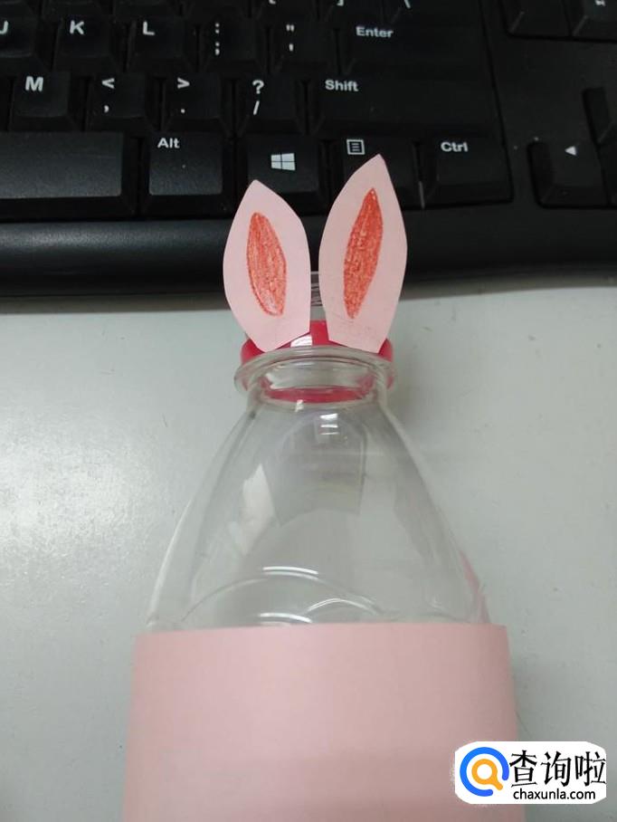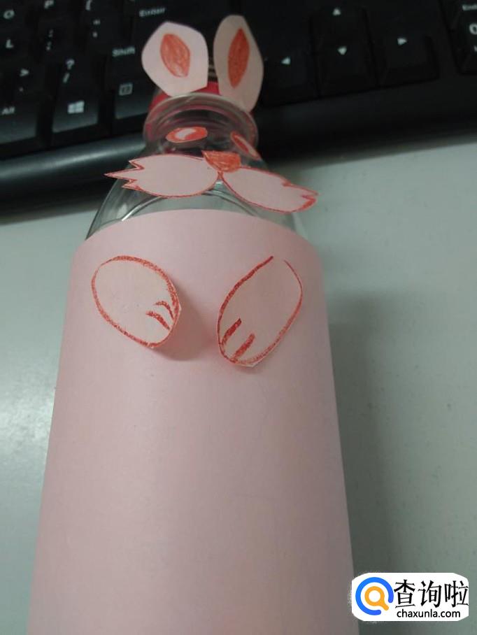 用彩笔在耳朵中间各画一个柳叶的形状,表示耳朵里的毛,并且把耳朵背面抹上胶棒,粘在瓶口处。