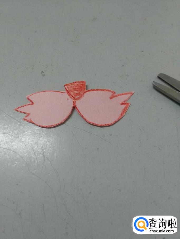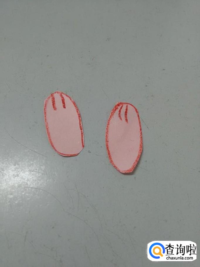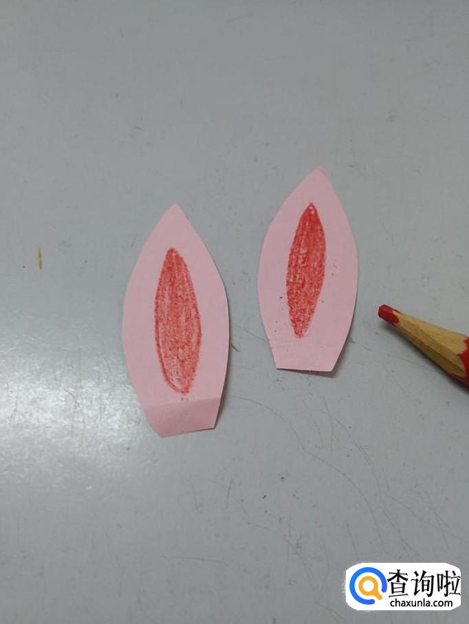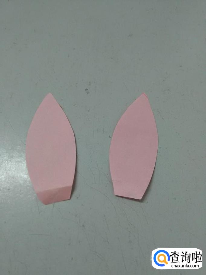 从彩纸上剪两个宽宽的叶子形状,当作小兔子的耳朵。